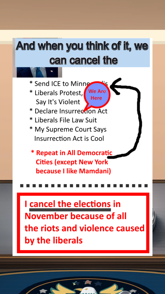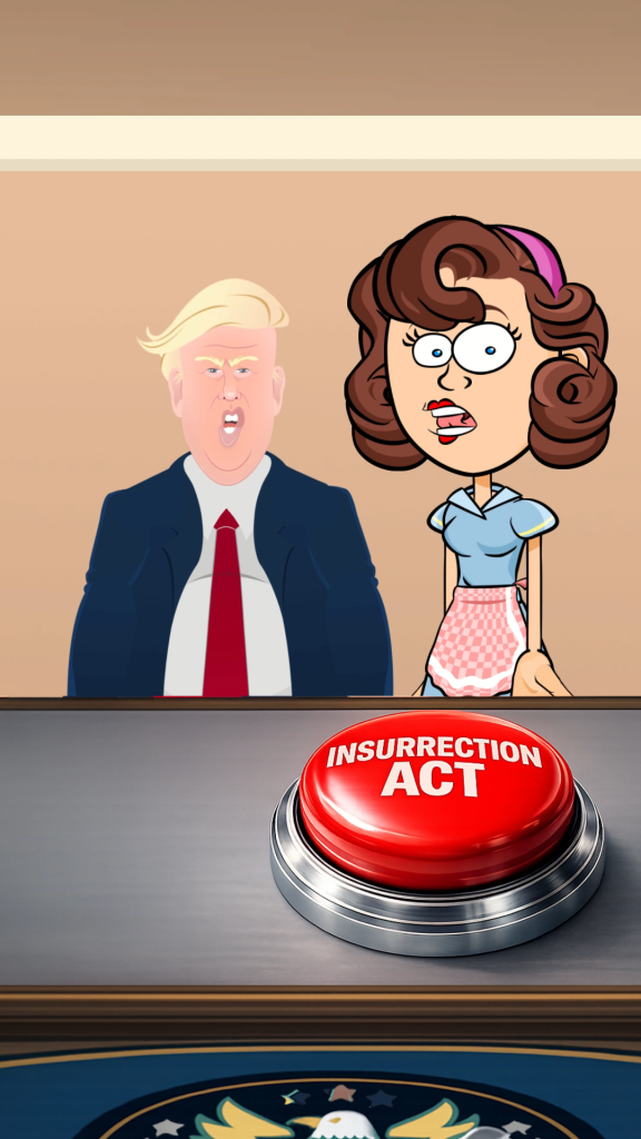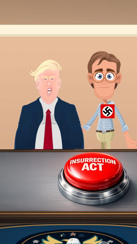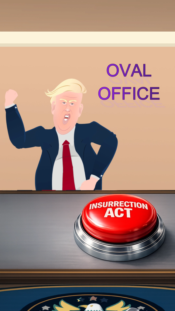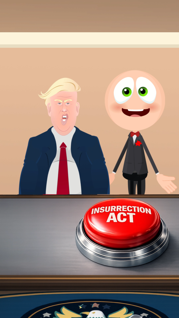 This video is all based on Trump’s threats to invoke the insurrection act. I was reminded of Trump 1.0 when he went on rants about his button being bigger than that of Kim Jung Un’s of North Korea. AI helped create the button image.