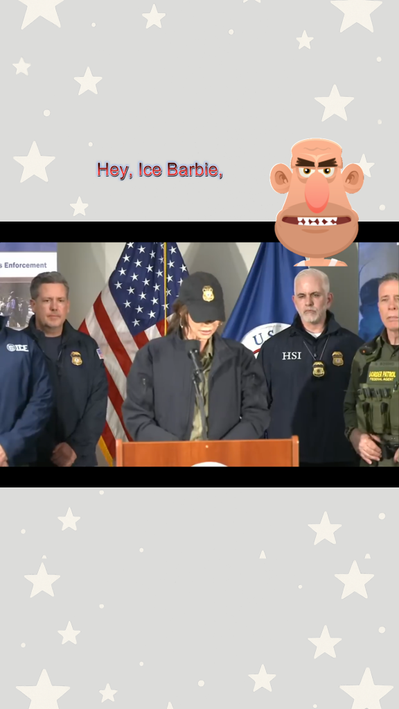 Animated satire of a cartoon character interrupting Kristi Noem at her press conference on the Minnesota ICE killing.